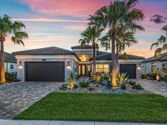 No expense has been spared in this original Napa model with an additional $300K in renovations/features added by the owner. This spectacular lushly landscaped lakefront home (4/4.1+Club Room) has impact windows, full house generator, surge protection, automation system for blinds, lights, cameras. A/C in garages, 4'X2' porcelain floors, designer window treatments & light fixtures, custom wall/ceiling moldings, built-ins, custom closets, upgraded baths + more! Gourmet kitchen w/gas, wood hood, quartz countertops, glass tile backsplash-all the bells & whistles! The great room has a beautiful wall feature w/lighting & fireplace. Luxurious master suite. You'll love the ''backyard resort'' with heated saltwater pool, spa, summer kitchen, awning, huge birdcage w/picture frame screen and turf. This home is located in Valencia Sound, a premier 55+ gated lifestyle community featuring a spectacular 39,000 square-foot clubhouse and fantastic outdoor recreational facility. Endless activities and opportunities for fun abound - there are activities, trips, shows, and clubs of all types. The clubhouse features an Elegant foyer and lobby, Grand ballroom with raised stage and dance floor, three spacious card rooms, Sports Lounge with billiard tables, Restaurant with indoor/outdoor seating, Poolside Bar, Arts and crafts center, Offices and ticket center for events, Catering kitchen and cooking studio, Exercise studio with ping pong, Fully equipped fitness center and men's and women's locker rooms with steam rooms, massage room and showers. There are four pools - a beautiful Resort-style pool and Shade Pavilions, Lap pool, Resistance walking pool, Grandchildren's wading pool, and an Outdoor whirlpool spa. There are six har-tru tennis courts with shade pavilions and lighting for night play, tennis pro shop and shaded tennis and pickleball seating areas, tennis pro, league play, eleven lighted pickleball courts, pickleball pro, league play, 4 bocce courts with league play and walking/jogging/biking paths throughout and just outside the community. Valencia Sound is conveniently located near shopping, restaurants, houses of worship and major highways!