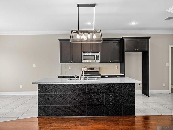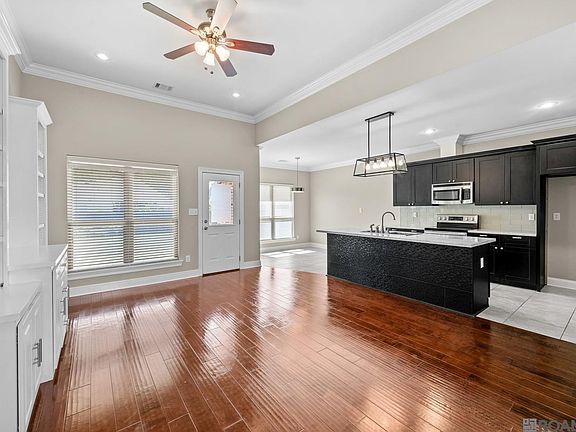 This beautiful 3-bedroom, 2-bath home boasts an open floor plan with no flood insurance required. The living room features laminate plank wood floors, built-ins, tall ceilings, and crown molding, creating a welcoming and spacious atmosphere. The kitchen is equipped with slab quartz countertops, modern light fixtures, a kitchen island, and a large pantry, perfect for any home chef. The master suite offers dual vanities, a separate tub and shower, a walk-in closet, and a private water closet for added convenience. The second bathroom also includes dual vanities. Enjoy outdoor living in the large backyard, offering plenty of space for relaxation and play. This home is a must-see!