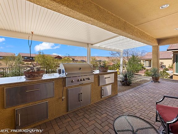 This highly upgraded Preserve model, on a costly elevated lot, has it all! Extra garage for your ATV/Golf Cart, Built-in BBQ in the back yard, close to the fabulous Sun City Mesquite Pioneer Recreation Center, and more! Kitchen is gorgeous with a large executive island, upgraded cabinets, large pantry, and stainless appliances. The living area is over-sized and has plenty of natural light. The cozy fireplace adds ambience for the holidays and our very short winters. You will love the dining area that is locate next to your culinary kitchen. Very convenient for daily use and entertaining. The main bedroom has lovely views of the fully landscaped backyard outside the large, bay window. Best of all, there is no neighbor directly behind this home. The main bath has dual sinks and an oversized custom shower. The attached walk-in closet has plenty of space! The office/den (with French doors) and guest bedroom/bath are on the opposite side of the home. The landscaping also has many upgrades including new drip system. . The custom pergola, custom BBQ area, and custom landscaping are already completed for you. SID PAID. New HVAC 2022. Newer bedroom carpets. Furniture pkg available.