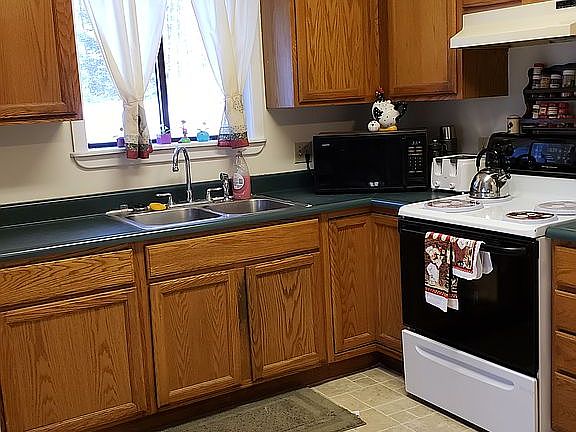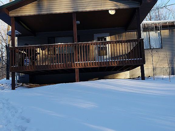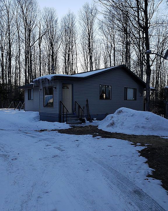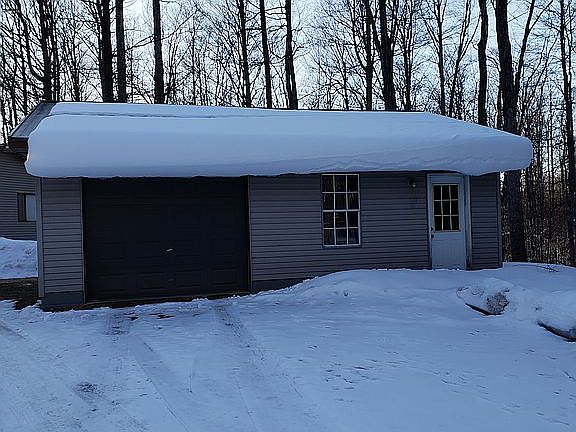 Stickbuilt. Kitchen, dining area, and livingroom open concept. Electric baseboard heat in bedrooms and bathroom. Gas stove in livingroom that looks like woodstove burning. New doors hung on hallway closets and bedrooms and bathroom. Newly painted on inside. Washer/ dryer in bathroom, has tub and shower. Has deck in back of house, and a foyer. Sidewalk from foyer to deck. Master bedroom has two closets, second bedroom one. Has a pantry in kitchen. Two wells. Fenced in garden area, big metal bonfire pit. This house is also off paved road.. House is on 5 acres hardwood. Has a portable garage included, not counting regular stick built garage. Hardwood floors and wall separating living and kitchen has been put up. Home Does need some repairs and finishes.