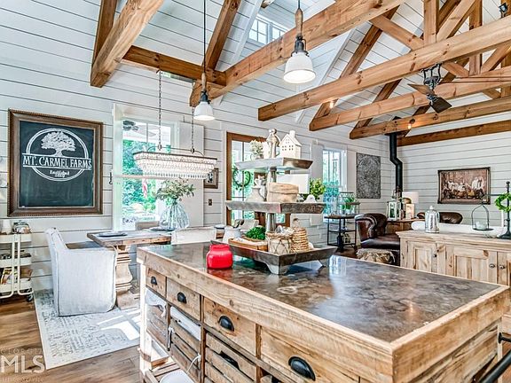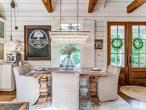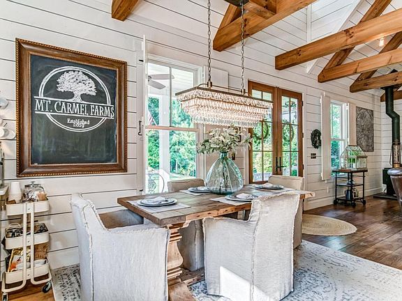 Mt. Carmel Farms offers an immediate self-sustainable lifestyle with magazine worthy beauty and charm.A true homestead;2 beautiful homes on the 12.49 acres.The main house on the property is currently featured in Farmhouse Style magazine.The main house has geothermal heating and cooling, envelope blown insulation,Kolbe windows, wood burning stove, backup generator,low maintenance cement siding,brick porches and metal roof.The open concept family room has a high ceiling with stained beams and shiplap walls. Carrera marble countertops adorn white cabinets in the kitchen.The wide plank hickory floors run throughout the main living and owners suite area. Master bedroom has an enormous walk-in closet. Up a small set of stairs lies an amazing woman's dressing room.This room could also serve as a beautiful nursery, if needed.The second bedroom on the main floor is part of the bunkhouse.It can be totally closed off until needed, it is on separate heating and cooling zones. The bunkhouse has 6 built-in bunks with each their own electrical outlet, personal fan and privacy drape make great hideaways for children or a great teen hangout. The upstairs of the bunkhouse is an additional large bedroom.A three car garage/shop has heating and AC, racedec flooring,high ceilings and car lift.Huge side covered porch overlooks beautiful pasture.43x17 foot RV parking pad with 50 amp outlet.The guesthouse has 2 beautifully decorated bedrooms,full kitchen,full bath,laundry,living room and side porch. It also has an outdoor shower and covered parking with circular drivee.This is an amazing "must-see" property.