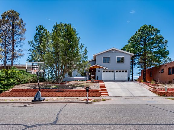 Nestled in the North Mesa neighborhood, this beautiful two-story home offers a tranquil retreat with breathtaking views of the Jemez mountains and the serene canyon landscape. You're greeted by a large low maintenance front yard adorned with mature landscaping and a welcoming front courtyard featuring elegant pavers. Stepping through the front entrance, your gaze is immediately drawn to the expansive open living room, boasting wall-to-wall windows that frame captivating views of the canyon. The space is accentuated by vaulted wood ceilings with skylights, complemented by wood floors that extend throughout the home. A cozy wood-burning fireplace invites you to unwind on chilly evenings, while convenient access to the fenced backyard allows you to bask in the panoramic views. Connected is the bright dining area and kitchen, perfect for entertaining guests or enjoying family meals. The kitchen features tile flooring, warm wood cabinets adorned with chrome hardware, sleek granite countertops, and stainless steel appliances. A peninsula bar seating area integrates with the living room, enhancing the flow of the space. Venturing down the hallway, you'll find a generously sized bedroom with access to a covered patio and a walk-in closet. A full guest bath with a single sink vanity. And a large laundry room with cabinets and access to the attached two-car garage. Ascending to the second floor, you're greeted by an open landing area with a cozy nook and views of the living space below. Two guest bedrooms await, one featuring a loft bed with shelves below. And a full guest bathroom with tile flooring. The highlight is the primary ensuite, offering a serene retreat with its spacious layout and private deck overlooking the canyon. The primary bath features tile flooring, a seamless double sink vanity with bronze hardware, and a spa-like tiled walk-in shower with glass sliding doors, creating a haven of relaxation and rejuvenation. Book your tour of this stunning home today!