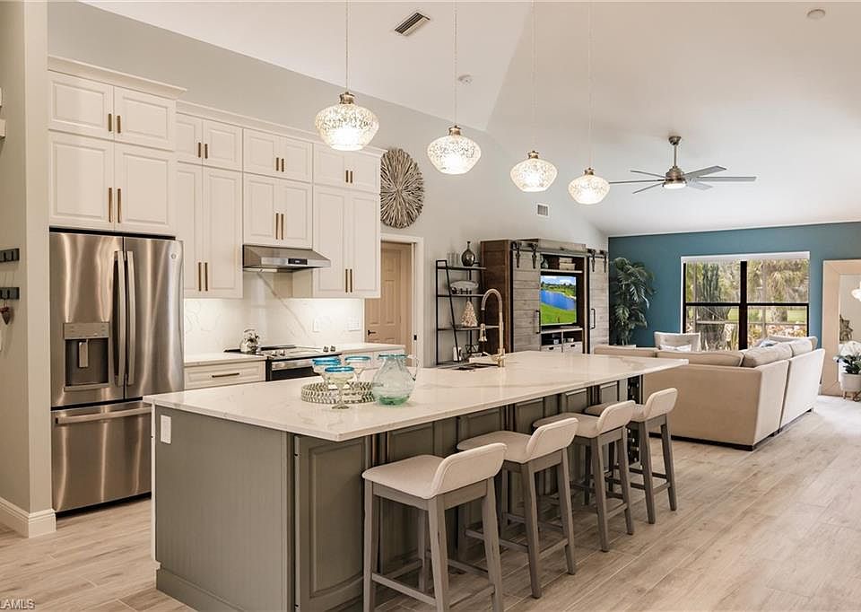 This beautiful 3 bed/2bath pool home oasis overlooking the pond and golf course has recently been renewed from head to toe with an eye to detail. The floorplan has been reconfigured to totally open up the living space with a massive kitchen island and magnificent great room that is unique to this community. It will truly feel so much bigger than the 1843sf the records reflect! Included in this masterful renovation are the custom bathroom remodels, laundry room upgrades, and so much more. You will absolutely love the new wall to wall porcelain plank flooring that is easy to maintain and timeless in nature. Hunters Ridge is one of those special places you can call home. There is golf membership included ($50k value), updated clubhouse with restaurant and sports bar, fitness center, community pool, and tennis/pickleball. Member only tee times are never an issue! It is located at exit 116 at 75 off Bonita Beach Rd. A short 10-20 minute drive to award winning beaches or RSW International Airport, it's close to an abundance of shopping and choice restaurants. Schedule an appointment to see why I tell people all they need to bring to this stunner is a toothbrush. Call today!