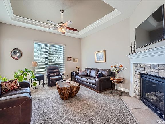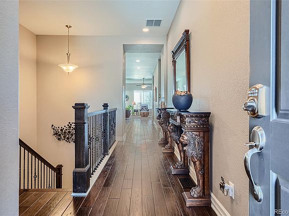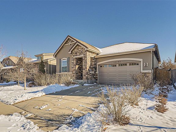 Welcome to this absolutely stunning home with over $70,000 in original builder upgrades! Enjoy open concept living with 10' ceilings, high end-wide-planked-wood flooring and decorative iron railings. Truly a Dream Kitchen with 42 inch cabinets, extensive tile backsplash, enormous granite island with seating for 5, recessed and pendant lighting, large walk-in pantry. stainless appliances, gas cooktop and double ovens. Large dining area open to kitchen and living areas. Living area with fireplace, coffered ceiling and ceiling fan. Spacious Owner's suite with crown molding, coffered ceiling and ceiling fan. Owner's bath with double sinks, granite countertops, plenty of cabinets and upgraded lighting. Main level with 2 bdrms plus a Study with ceiling fan and chair railing, upgraded tile and granite throughout the home. Main floor laundry with cabinets. Finished basement with large recreation room, two additional, nice sized bedrooms, another bathroom with shower, a bonus area which makes a great space for a workout room, craft room or play area. Storage room. Low maintenance backyard with private covered patio and a gas line. Two car attached garage. Fantastic Richmond Annette, ranch style home with over 3,700 finished square feet. Low-maintenance exterior to lock up and leave on a dime! Back yard does not face any homes and is very private! This is a great community, conveniently located near Park Meadows mall, Lone Tree Golf Club & Hotel, Light Rail, Sky Ridge Medical Center, Bluffs Regional Park Trail, shopping, dining and pubs. Easy access to E470, DIA, Buckley AFB, DTC and downtown Denver.