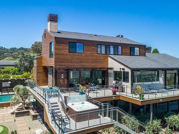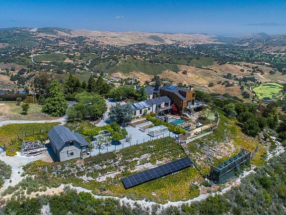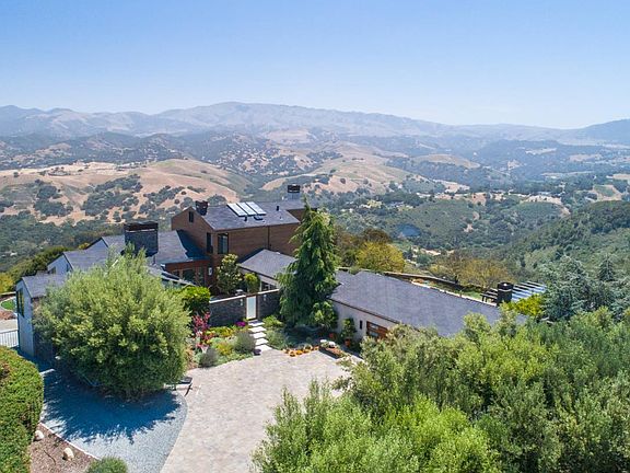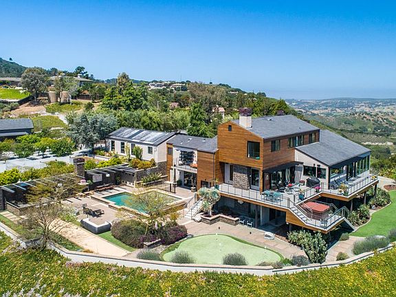 Magnificent 6900sf estate property on 5.8 acres with forever views. Modern masterpiece invites both entertaining & relaxation. Enter the private gate & courtyard to discover grandeur & serenity through towering doorways to soaring ceilings & panoramic views. Cool finishes of concrete, stone & stainless steel find warm balance in abundant natural light, plastered walls & wood accents. Main level has two primary ensuite bedrooms, one with large zero entry shower and stainless-steel tub, office with beautiful built-ins, spacious living room with stunning hearth. State-of-the-art kitchen boasts Viking appliances, butler pantry, wine room & opens to family room with fireplace. Downstairs is a large entertaining area with wet bar that opens to pool area, plus a gym & sauna. Pool & deck area offer built-in BBQ, hot tub, bocce ball, putting green, gardening house, barn, orchard, vegetable beds. Wrap around deck & 3-car garage. Sustainable features include well, water catchment system & solar.