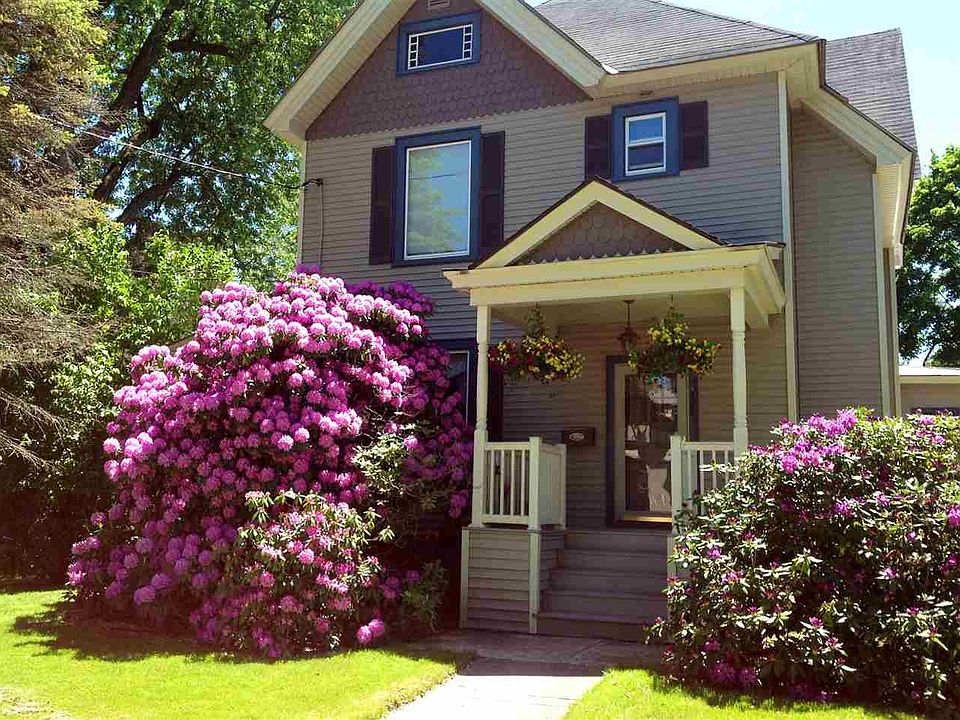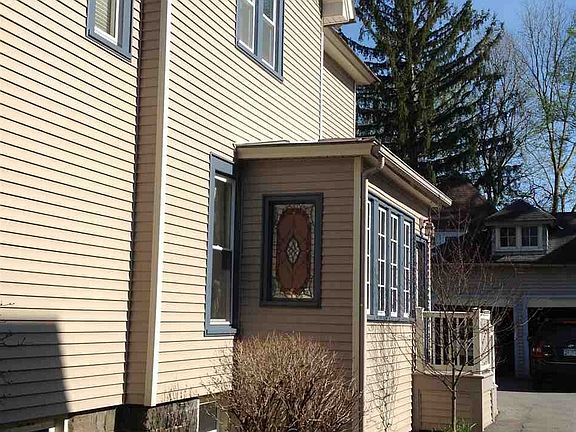 Well maintained Victorian w/4 BRS & 3 full BA; hw floors thruout; many recent updates: roof, windows, siding, furnace, hot water heater, foundation work, 1st floor bath w/heated floor, stainless ref. & dishwasher; lg foyer w/closet; open staircase; Kitchen with plentiful cabinets with eating area that leads to large deck; back set of stairs; older ceramic tiled baths upstairs; double LR; shared deeded driveway (never a problem); Includes lawn mower, snow plow, A'dak outdoor furniture, other furniture neg.