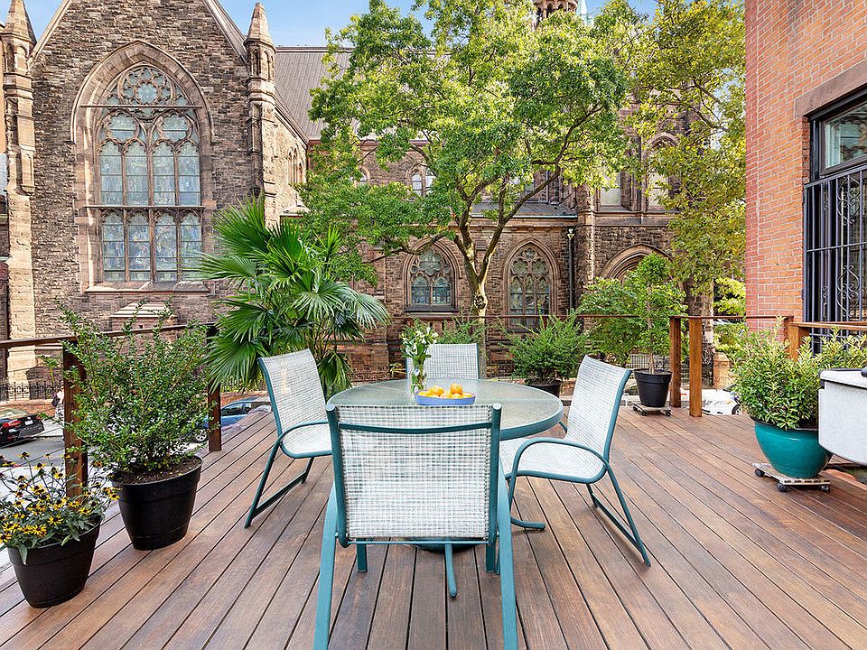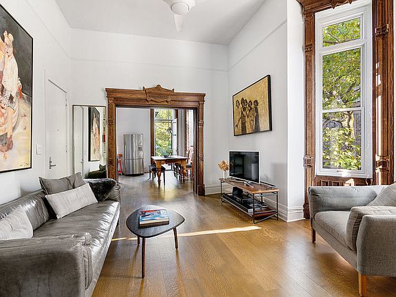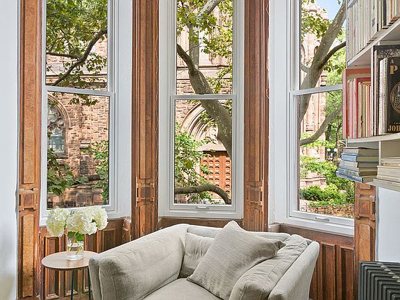 If the charm of Park Slope is calling, you will love coming home to this exquisite parlor floor apartment with triple exposures wrapping the corner of Sterling Place and 6th Avenue - one of Park Slope's most majestic locations. Here modern features meet historical elegance in this very special floor-through with a large private ipe deck, 12-foot-tall ceilings and 9 oversized windows offering picturesque views of tree-lined streets and the stately St. Augustine's Church. Apartment 2 is a rare offering that boasts an airy and light-filled living space. In addition to the newly refinished deck opening directly off the dining area, you'll also enjoy walnut-stained quarter-sawn wide-plank hardwood oak floors, French doors, original wood trim and moldings, exposed brick, and decorative arched brick fireplaces. There are abundant closets, much built-in storage and other refined finishes throughout. Just 1 flight up, the loft-like ambience and spacious rooms afford a gracious backdrop for living and entertaining. Relax in the large, sunny living room and host dinner parties in the dining room that can easily seat 8 guests. Prepare meals in style in the open kitchen equipped with full-height custom cabinetry and premium appliances including a Fisher & Paykel fridge and new Bosch dishwasher. After dinner, step out to your wonderful private ipe deck and lounge under the stars with a coffee or cocktail. Or stay indoors and leave the sliding screen door open for a delightful breeze. The oversized and serene primary bedroom overlooks lush greenery, and the windowed office, which could also serve as a nursery or second sleeping area, faces distinctive brownstone architecture. Both rooms offer double-height closest, one of which is custom. Built in 1876, 128 6th Avenue is a self-managed, 5-unit pet-friendly co-op with a common roof deck, dedicated basement storage and free onsite laundry facilities (though you're allowed to install a washer-dryer in-unit). The location is ideal, with the B/Q/2/3 and LIRR trains, shops and eateries, 2 farmer's markets, not to mention Grand Army Plaza, the Barclay's Center and Prospect Park a few blocks away. Nursery image is virtually staged.