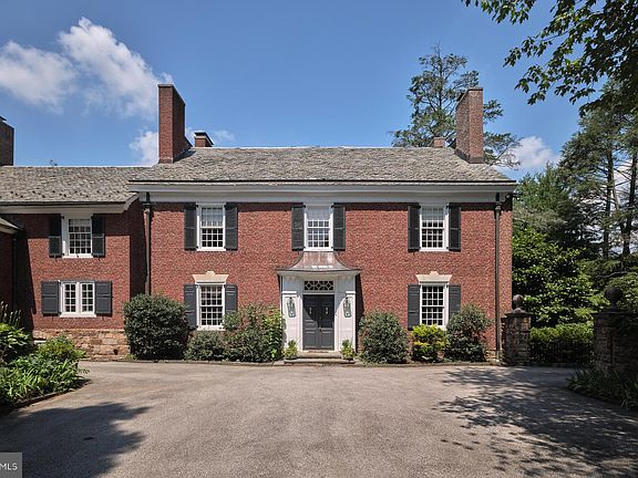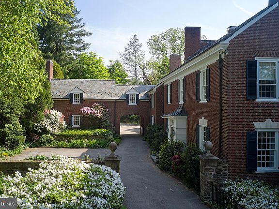 Set behind a gated entrance, you enter a beautiful stone-walled front courtyard enhanced by flowers and an intimate fountain. This home has all the sophistication and class of the finest estate homes on the Main Line. In 1928, it was designed and built in the spirit of Horace Trumbauer’s last great estate, Ardrossan, for the Montgomery family. As with Ardrossan, this home is an outstanding example of early 20th-century Georgian-style architecture and is a refreshing oasis with 1.02 acres of property and a deeded additional lot of .49 acres which with an acceptable offer the buyer of the main house will have first right of refusal. This is all located in the heart of the Main Line suburbs. This brick residence has a commanding, stately presence, with many design elements rooted in classical architecture. There have been newer additions for today’s living: An enlarged kitchen, informal dining room, and family room that blend seamlessly with the magnificent structure and its old-world features. Upon entering, the bright reception foyer runs front-to-back and front-to-side and is trimmed in rich millwork and built-in bookcases, with black and white parquet floors and a lovely stairwell. To the right is a formal living room with fireplace, random width and length wood flooring, multiple seating areas, plenty of large windows, and a wall of paned glass with French doors to a step-down, awninged, Pennsylvania stone terrace that leads across to a terraced stoned dining area. Terraces run along almost the entire length of the back of this home. To the left of the living room is the formal dining room with fireplace, same wood flooring as the living room, and includes a lovely garden mural painted by the famous faux artist Carroll Barnes with four floor-to-ceiling built-in corner cabinets plus secret side panels for more storage. The kitchen is a chef’s dream. In addition to the original kitchen, it now has an ample-sized, wood cutting board island, stainless steel appliances including a Viking gas range, a wet bar area, an ice maker, and plenty of natural light. Adjacent to the kitchen is an addition of a lovely informal dining area with high ceilings and wall of windows and glass French doors to the pergola-covered terrace. There are wide, beautiful stone stairs from each terrace to access the grounds and pool. This home’s private quarters include two ensuite bedrooms on the 2nd and 3rd floors, and two more bedrooms on the second-floor main house, which share one hall bathroom. The main suite is spacious and comfortable with a fireplace, sitting area, balcony, walk-in closets, and his and her bathrooms. A study/office is part of the main suite. Across the hall from the main bedroom is a ladies’ dressing room with a wall of closets for additional storage. The additional two bedrooms on the second level are all generously sized and feature views of the grounds. There are back stairs off the second-floor hall from the study/office and the mud room area on the first floor. These stairs connect the main house to three more bedrooms and a bath above the porte cochere and three-car garage. On the 3rd floor over the main house, there’s an additional en suite bedroom and large attic providing additional storage. This home has lush plantings and a verdant lawn. A delightful wildflower meadow is behind the home, with a charming old stable used as a shed and a giant dollhouse just for fun. This home is the complete package offering privacy, fabulous quality construction, and a long list of updates to create a modern, comfortable home. The property is near the Villanova College campus, has countless dining and shopping options, medical offices, and hospitals, is close to public transportation and interstate highways, and is located in the award-winning Radnor School District. Don’t miss this fabulous opportunity!