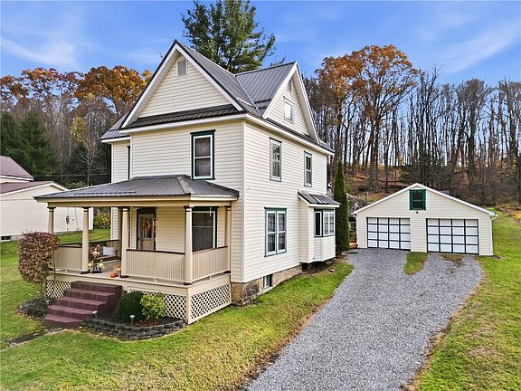 Fall in love with this charming move-in ready 3 bed, 2 bath farmhouse in Sandycreek Twp near Franklin Area High School & Sandycreek Elementary. Minutes from downtown Franklin, the Allegheny River, & bike trails. Enjoy an inviting covered front porch perfect for a swing. The 1st floor offers a formal dining room with arched entry to the living room, both with wall-to-wall carpet. The chef’s kitchen features a large island, tile, full appliance suite, custom cabinetry, ceiling fan, & a bright bay window. Off the kitchen, find a convenient laundry room/full bath. Upstairs, the master bedroom includes a full en suite bath, plus 2 additional bedrooms with ceiling fans and closets. Bedroom 3 provides access to a large unfinished attic for storage or to be finished down the road. Outside, enjoy a 2-car detached garage, large back deck, & a separate indoor pool room. Pool needs some TLC. The nearly 1-acre yard is perfect for entertaining with a firepit, boulder, & plenty of space to play.