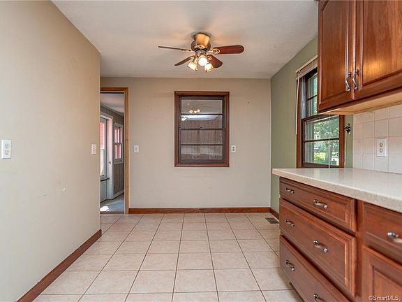 This Ranch home offers 1248 square feet, 912 sq ft of living on the main level and an extra 336 sq ft of finished basement on the lower level, a one car oversized garage with overhead storage, a work bench, and 220 amp electrical, three bedrooms, and one bath, on a desirable corner lot. Walk up the front steps into a breezeway, perfect for winter time boots or summer time beach apparel with access to the garage, the kitchen, or the back deck. Enjoy your eat in kitchen with ceramic tile flooring and Swan Stone counter tops. All three bedrooms and living room are hardwoods. In 2007, a French drain system was installed with a battery back up sump pump system which has a conveying lifetime warranty. Home is close to down town Putnam and all it has to offer. Selling as is. Will need a new roof and new windows, priced accordingly. Schedule your private showing today