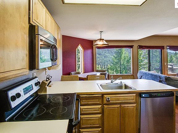 Experience the year-round activities of Schweitzer Mountain Resort from this Wildflower Condominium. A bright and spacious 2 bedroom, 2 bathroom offering gorgeous mountain views. The Living room is open to the dining and kitchen area with a built-in fireplace set into a tongue and groove accent wall. The large windows allow for stunning views of the landscape. Kitchen includes stainless appliances, peninsula breakfast bar, and plenty of cabinet storage. Both bedrooms are spacious, with windows to provide natural light. Master bedroom enjoys en-suite bathroom with a large stall shower. Enjoy soaking in the hot tub while taking in the sounds and sights of the mountain. There is a large storage room in the garage to lock up all the toys. Community washer/dryer, and sauna to top it off. Be a part of North Idaho's premier four season resort!