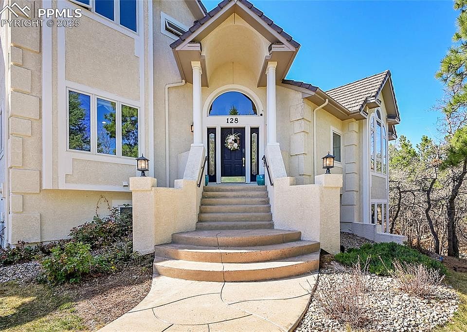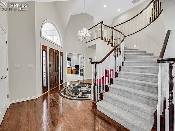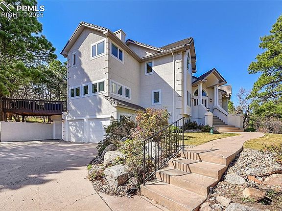 Discover timeless elegance and modern comfort in this stunning 5-bedroom, 5-bathroom custom home, quietly nestled on a tree-lined 0.6-acre lot in coveted Broadmoor Bluffs Park—without the restrictions of an HOA. Offering nearly 5,000 square feet of beautifully finished living space, this property was designed for both grand entertaining and everyday living. Step inside to an impressive two-story foyer with a sweeping staircase and sparkling chandelier that immediately sets the stage. The main level features a private office with custom built-ins, a formal dining room, a spacious living area, and an updated powder bath. The heart of the home is the gourmet kitchen, where rich cabinetry, granite countertops, a gas cooktop, and a butler’s pantry seamlessly connect to the dining room. A dual-sided fireplace warms both the adjoining family room and the sunroom, where natural light pours through walls of windows. Upstairs, the luxurious primary suite offers its own fireplace, a spa-like 5-piece bath, and a steam shower for the ultimate retreat. The fully finished walkout basement adds endless possibilities—home theater, fitness room, playroom, or private guest quarters. Thoughtful upgrades throughout enhance comfort and convenience, including radiant floor heating, refrigerated air, a whole-house fan, dumbwaiter, laundry chute, radon system, and a spacious laundry room with utility sink and storage. Outside, enjoy Colorado living at its best with a composite deck overlooking your wooded backyard sanctuary. The electric pet fence and lush landscaping make it easy to relax or entertain in complete privacy. This home blends sophistication with function in one of Colorado Springs’ most desirable neighborhoods. Schedule your private tour today and experience Broadmoor Bluffs living at its finest! See attached supplement for list of upgrades/updates to the home.