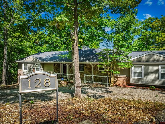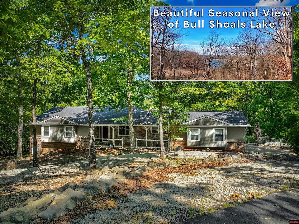 Welcome to your dream home! This stunning 2,680 sq ft residence bordering Corp land offers a seasonal lake view of Bull Shoals Lake complimented by large windows that flood the space with natural light- perfect for those who appreciate natural beauty. With an open concept design, the main level features 3 spacious bedrooms and 2 bathrooms. The living area boasts vaulted ceilings, large wood beam, and a beautiful double-sided stone gas insert fireplace, perfect for cozy evenings, and opens up to a huge back deck where you can enjoy the serene landscape. Two sun rooms provide additional space for relaxation and soaking in the views year-round. The walkout basement is a versatile space, featuring a family room with a wood-burning fireplace, a 4th bedroom, a 3rd bathroom, and a separate storage room. The fenced-in back yard is ideal for pets to play safely. This home seamlessly blends comfort, style, and functionality, making it the perfect retreat.