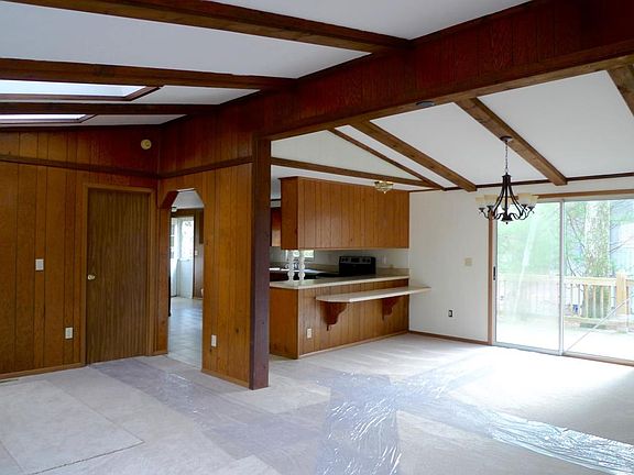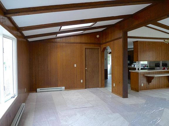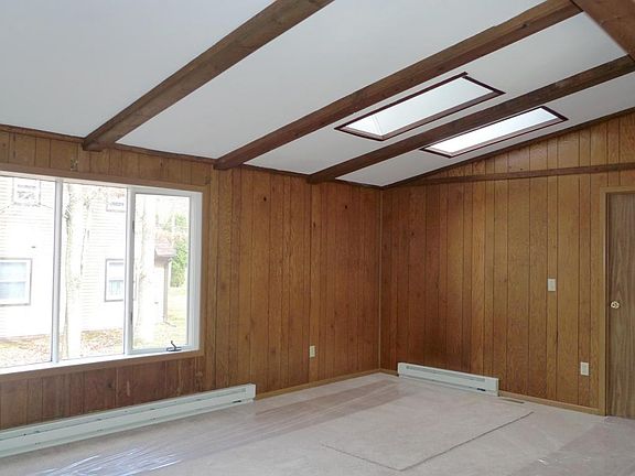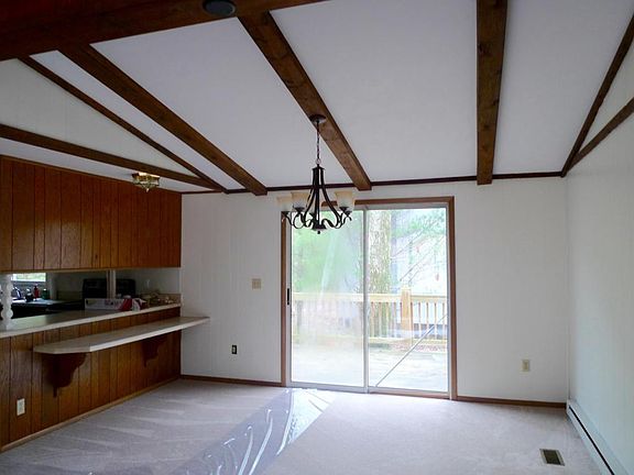 New paint, laminate flooring , new baseboard heaters, new lighting! Beamed ceilings in LR & DR. Bright 3 BR, 2 BA ranch on level lot w/skylights, 1st floor laundry hook-ups, eat-in kitchen w/tile floor, garden tub in master bath, sliding door to full width rear deck, shed, full basement w/bilco door. Newer roof too!