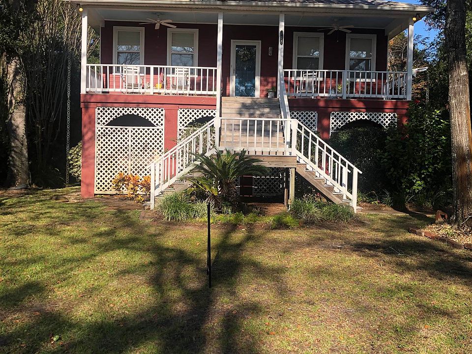 Location, location, location, as we always say! But this charming 2 bedroom, 2.5 bath has it! So close to everything historic St. Marys has to offer, but in a private setting. There is a front porch with a "peek a boo" water view, a screened in back porch and a sun room with a wooded view. When you walk through the front door, there is a spacious combination living room and dining room with a gas fireplace surrounded by built in book shelves and hardwood floors. The kitchen has an island with an oven in it, beautiful vintage custom cabinets, with a cozy den attached. Flooring in the living room, den and laundry room is saltillo tile. The laundry room located off the kitchen, has tons of storage and a sink. The primary bedroom has a generous walk in closet with wooden shelving, while the second primary bedroom is located downstairs with a bathroom, office and additional storage. There is a separate private entrance from the fenced in back yard. This split floor plan makes this house ideal for 2 VRBOs. Fencing encloses the back yard making it perfect for pets or children. The double garage also has additional storage