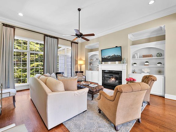 Discover refined living in this exquisite all-white brick estate, perfectly positioned in one of the Triangle's most prestigious communities- Colvard Farms. Thoughtfully designed for both comfort and grandeur, this 5-bedroom, 4-bath residence offers predominantly main-level living, seamlessly blending architectural sophistication with everyday ease. Step inside to soaring coffered ceilings, sun-filled interiors, and bespoke designer drapery. The expansive primary suite is a private sanctuary, featuring a spa-inspired bath with luxe finishes and dual walk-in closets. A gracious office—or fifth bedroom—boasts dramatic windows and a private en-suite bath, while two additional main-level bedrooms with new carpeting share a stylish buddy bath. Upstairs, a generously sized guest suite, versatile bonus room, and abundant storage provide endless possibilities. Enjoy tranquil mornings in the light-drenched breakfast room or savor evenings on the screened porch overlooking your lush, private backyard retreat. From here, scenic trails lead directly to the community's exclusive amenities—including a clubhouse, tennis courts, playground, and resort-style pool. Perfectly situated for effortless access to Durham, Raleigh, and RTP, this home offers not only a residence, but a lifestyle of unparalleled elegance. **NEW roof 2025** **Floors will be beautifully refinished by the seller following their move**