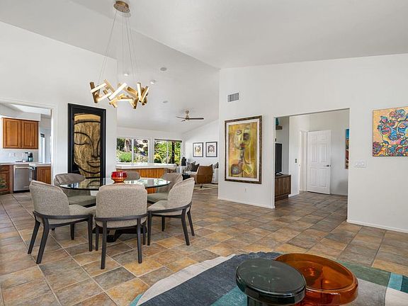 This beautifully designed 4-bedroom, 2-bath home offers 1,914 square feet of living space in the heart of Palm Desert in the gated community of Hovley Court. Blending modern comfort with resort-style luxury, the open and airy layout welcomes you with high ceilings, expansive windows, and a seamless flow between the living, dining, and kitchen areas.The spacious living room features a cozy tiled fireplace, vaulted ceilings with recessed lighting, and sliding glass doors that open to the lush outdoor patio, filling the space with natural light. The adjoining dining area continues the open-concept design, with neutral tile flooring that connects effortlessly to the kitchen and entertaining spaces.The chef's kitchen is both stylish and functional, showcasing custom wood cabinetry, sleek quartz countertops, and a large waterfall-edge island perfect for casual dining or meal prep. Stainless steel appliances, including a gas cooktop, built-in microwave and wine cooler, complete this modern culinary space.The primary bedroom suite is a serene retreat featuring vaulted ceilings, plush carpeting, and direct access to the backyard. The spa-inspired updated ensuite bathroom includes marble finishes, a freestanding soaking tub, a frameless glass shower with dual shower heads, and a custom double vanity. Just outside, a private outdoor shower enhances the resort-like experience.Two additional guest bedrooms offer comfort and versatility, while the fourth bedroom has been thoughtfully converted into a stylish TV room and home office with built-in cabinetry and a workspace nook--ideal for remote work or relaxation.Step outside to your own private paradise. The backyard is a stunning desert oasis with lush tropical and desert landscaping, a sparkling pool and a relaxing hot tub and a shaded pergola dining area perfect for entertaining. A cozy outdoor fireplace, misting system and shower complete the resort ambiance, offering the ultimate indoor-outdoor lifestyle.Additional features include 2020 5 ton Lennox AC, new water heater, new sliders, separate laundry room with newer washer and dryer, and a spacious three-car garage with mini-split AC.This home perfectly combines modern design, functionality, and resort-style living--an inviting sanctuary for both everyday comfort and effortless entertaining.