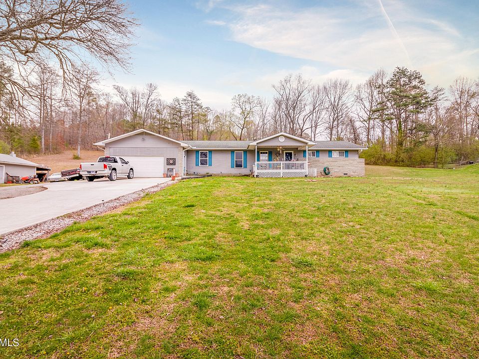 One level living, 4 bedrooms, spacious living room and dining area, gas fireplace, large windows that allow mountain views. Fenced yard. Attached 2 car garage. PLUS a detached garage/workshop with electric, heat/air thats 1344 square feet! Roof, windows, vinyle siding, central heat and air all replaced within past 5 years. All situated on 1.9 acres!