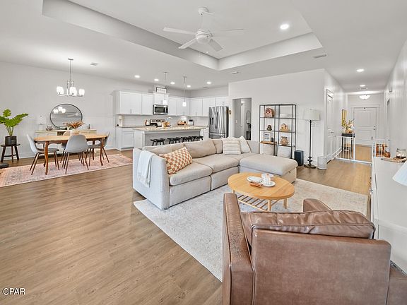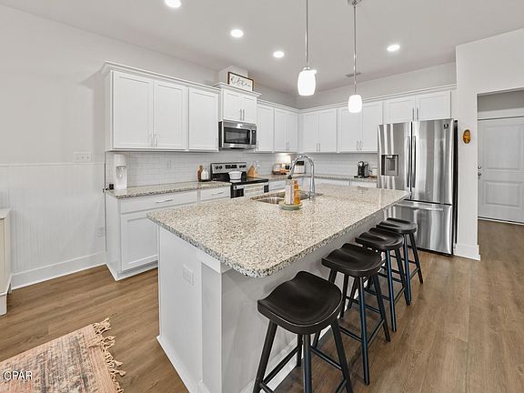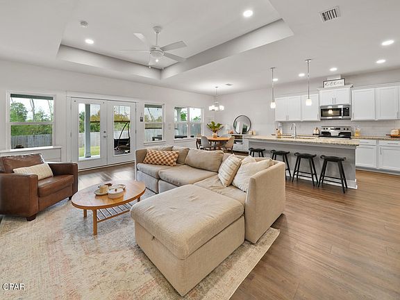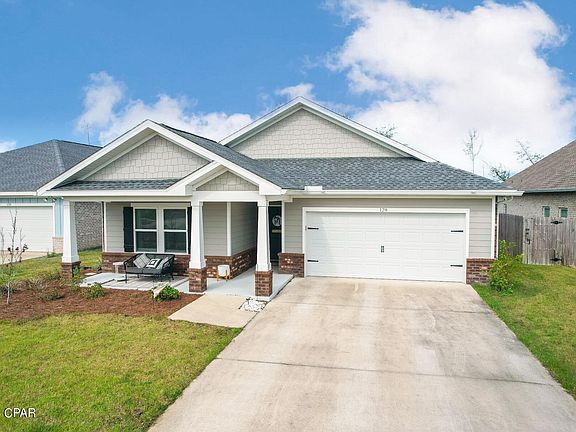 Beloved CAMRYN'S CROSSING in Lynn Haven built by Southern Coastal Homes boasts this beautiful open concept with 4 bedrooms including a large living room that is open to the expansive kitchen and dining area. Kitchen has a large center island, subway tile backsplash, and stainless appliances. French doors lead from the great room to the large covered patio. Spacious main suite has tray ceiling, double vanity, garden tub, and walk-in closet. Neighborhood offers walking park & playground. Exterior with Rain Bird sprinkler system, large back yard, and expansive covered porch.