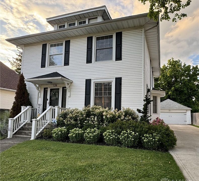 Welcome to 128 E. 1st Street in Springfield, Ohio. This Ridgewood home has been completely renovated including an updated kitchen with quartz countertops, a modern backsplash, refinished original wood flooring, stainless steel appliances, a five-burner gas stove top, new soft close cabinetry and bar seating. The kitchen walks out to a covered porch and a newly poured concrete patio and driveway. The two full bathrooms were completely renovated with new tiling, bathtub and shower along with new vanities. There are three bedrooms on the second floor and the attic was finished, adding space for a fourth bedroom. The garage door, furnace, and air conditioner were all new along with all new electric wiring and windows throughout the home along with a new roof in 2022. The two-car garage and large driveway provide plenty of space for coverage and vehicle parking along with a professionally landscaped yard, privacy fence, garden, and great outdoor space for entertaining and family gatherings.