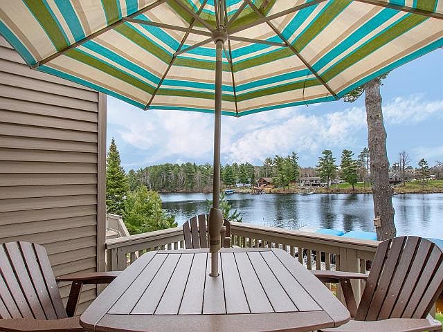 Exceptional condo on prestigious Eagle River Chain! In the center of Eagle River across from the first hole of the four-star rated Eagle River Golf Course. Immaculate 3 bedroom/4 bath has main level EASY living space w/master en suite, great room, laundry facilities, powder room & large private deck. High-end upgrades include: granite counter tops, custom tile back splash, stainless steel appliances, "reclaimed barnwood style" Mohawk tile flooring throughout main level. Master en suite has Closets Plus for maximum storage w/soft close drawers, shoe cubbies, built-in hamper; custom tile shower w/granite counter tops. Great room gives you custom cultured stone floor- to-ceiling gas fireplace & expansive windows provide spectacular waterfront southern exposure views. Second level has another bedroom, full bath, large loft area w/more water views to work from home; lower level has large family room, bedroom, full bath, utility room w/plenty of storage. Enjoy the good life today.