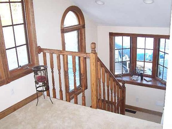 Unique! Gorgeous! Stunning views! Location! The lake & bay views are magnificant! This 4 bdrm/1.5 bath home is nestled into the hill & the lot expands to 114 ft lakeside. Other features: seawall, piers, privacy, deck, firepit w/permanent benches, custom lakeside windows, Great Room open to kitchen, skylights, heated ceramic tile flooring, spa tub, beautiful dark trim (fluted w/rosette accents), banisters, walk-out basement & more! Lake views from each side of the home. Ceramic Tile