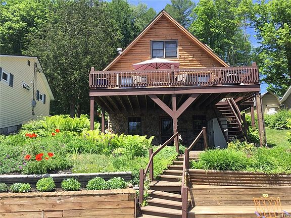 Beautiful year round Lake Moraine Log home in small Lakefront neighborhood. Cozy setting with gorgeous views of the surrounding hillsides from the upper deck, lower patio or dock! Large open kitchen with island, new appliances, hardwood floors, open to the living room and dining room. The second floor boasts 2 bedrooms and a completely renovated bathroom with tiled shower and floor. House has central AC! Large upper deck great for relaxing or entertaining. Sunsetter awning to provide shade when needed. Lower level has bar and family room w/half bath. Utility room includes a shop area. Patio off the family room to add additional outside space. Two car garage with plenty of storage. Additional parking next to garage. This beautiful home offers views of the lake from all levels. A Must See!