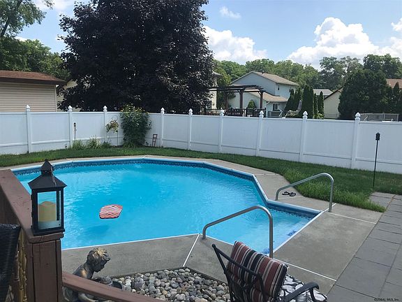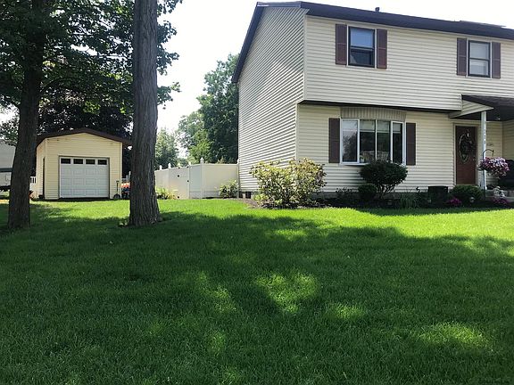 Corner lot with large parking pad and garage. Large in-ground pool with deck and fenced yard. Separate large shed. First floor has eat-in kitchen, formal living and dining rooms, 1/2 bath and family room with working fireplace. Second floor has three bedrooms and one full bath. Partially finished basement with bar room and separate room for office or bedroom. Central Air! Hardwood floors recently refinished and carpeting. Furnace is only one year old and pool is newly relined. In-ground sprinklers.
