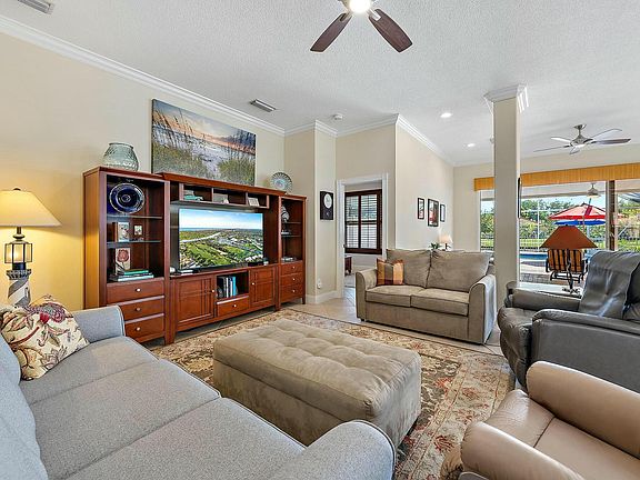 Stunning Lakefront & Private Pool Home in The Hamptons at Maplewood. This beautifully updated 3-bed, 2-bath, 2-car garage DiVosta-built home offers nearly 2,000 sq ft of solid concrete construction with soaring ceilings and abundant natural light. The open floor plan flows seamlessly into a chef's kitchen with granite countertops, stainless steel appliances, and ample space for gatherings. The extended primary suite features dual walk-in closets, a spa-like bath with two vanities, and a gorgeous walk-in shower. Outside, enjoy a rare freeform pool, spa, expansive screened-in patio, and breathtaking lake views. Located in a charming, tree-lined community, minutes from top-rated schools, beaches, dining & more.
