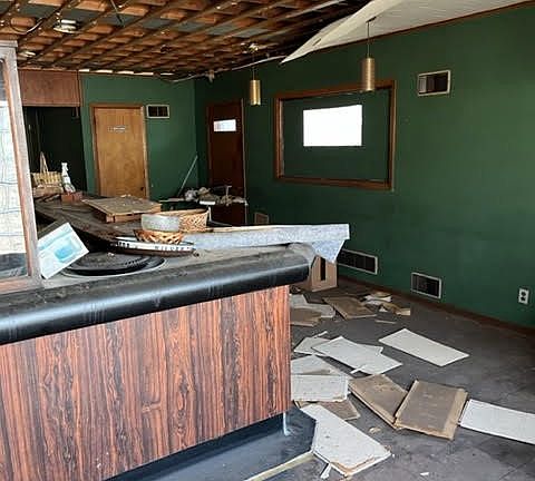 This mix use property features three bedrooms and two bathrooms on the second floor, a kitchen and huge bar with 2 bathrooms on the first floor. It has a huge parking lot. It has been vacant many years. The family built it as a bar/restaurant and living quarters for themselves.