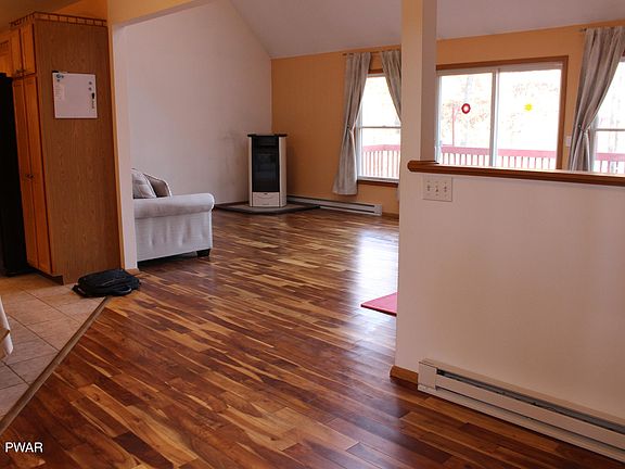 Take a look at this beautiful, spacious, contemporary home w/ open floor plan. Unique Brazilian hardwood flooring alongside a Cathedral ceiling in LR/DR w/ skylights and fireplace. Seasonal lake views, Energy efficient Pellet stove, new hot boiler, and new paint splashed across the garage and deck.