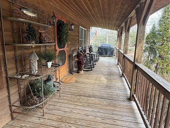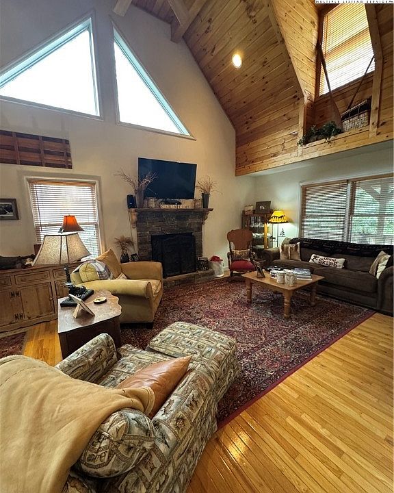 From the moment you step through the front door, you’ll be drawn to the stunning tongue-and-groove vaulted ceilings, ample windows and the stone gas log fireplace. Seamlessly creating the mountain atmosphere you’ve been searching for. The open-concept main living area features a comfortable living room that flows into the kitchen and dining area where the bar offers additional seating. The main-level primary bedroom has an en suite bathroom with large soaking tub and separate shower. For convenience this level also offers a half bath just off the living room area. The upper loft offers a spacious open concept, housing the second bedroom and a full bath, providing comfort and privacy for guests. The lower level presents endless possibilities, currently featuring a large den, a third bedroom, a full bath, with potential for a game room. This level also provides access from the golf cart garage/workshop, with access to the exterior of the home. Step outside and be captivated by the expansive outdoor decking and entertaining space offering outdoor dining area, firepit area and much more! Here you can enjoy the beautiful mountain surroundings. The home also boasts a large covered front porch with wraparound access, ample parking, and convenient drive-through driveway access. While the garage accommodates a golf cart and includes a workshop area, please note it is not sized for a full vehicle. Only a compact. The home’s heating and air system requires repair; however, supplemental electric heat and propane gas logs are in place. Don’t miss the opportunity to view this unique property and make it your own mountain retreat. The owner replaced all the lower level carpet just after last year’s storm, which minor water intrusion was experienced in the lower area. High Crest Section of Linville Land Harbor is a Homes Only Section. Linville Land Harbor offers a multitude of amenities. Water, sewer, cable tv, internet, trash collection, road maintenance, outdoor pool, 24hr security and many summer and winter activities are included in the yearly dues. Golf, Tennis, Pickleball and Fishing are extra fees to join. Flat Screen TV in Living Room conveys bur other Furnishings do not convey. Hone is set up for plug in generator.