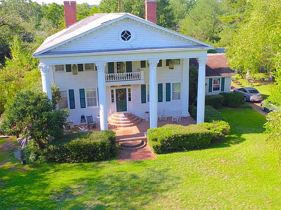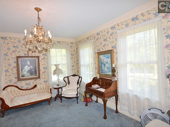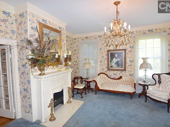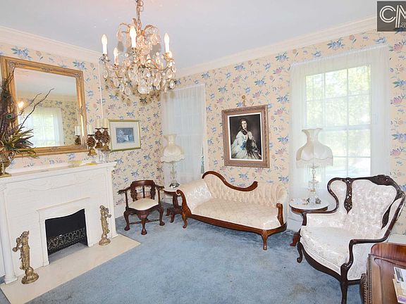 1850's Georgian style plantation home with beautiful architectural features to include moldings, trim work, 12 ft ceilings with medallions above chandeliers. The original hardwood floors are throughout, under carpet and parquet flooring. Transom windows and French doors allow the natural light ro radiate in every room. Beautiful fire places in every room, 8 total with large bedrooms. The bathrooms have sitting areas dressing rooms attached. Outside, you are secluded on 5.6 acres, brick driveway, and an old windmill. The columns on the front of the house are from the home that General Sherman used as headquarters during the occupation of Columbia, while large church style pendant lights hang behind them. The carriage house stables still remain on the property. Great for event venue, Airbnb, bed and breakfast as income property, or just live in the Antebellum you've always wanted.