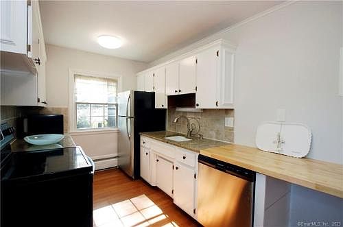 Beautifully renovated, Super bright and clean rental - End Unit / second fl. Rent includes heat and hot water. Eat in kitchen with Granite, hardwood floors, crown molding and paneled details, Freshly painted, Great closet space. Convenient to train, hwys and shopping. Reserved parking space, Laundry in same bldg;