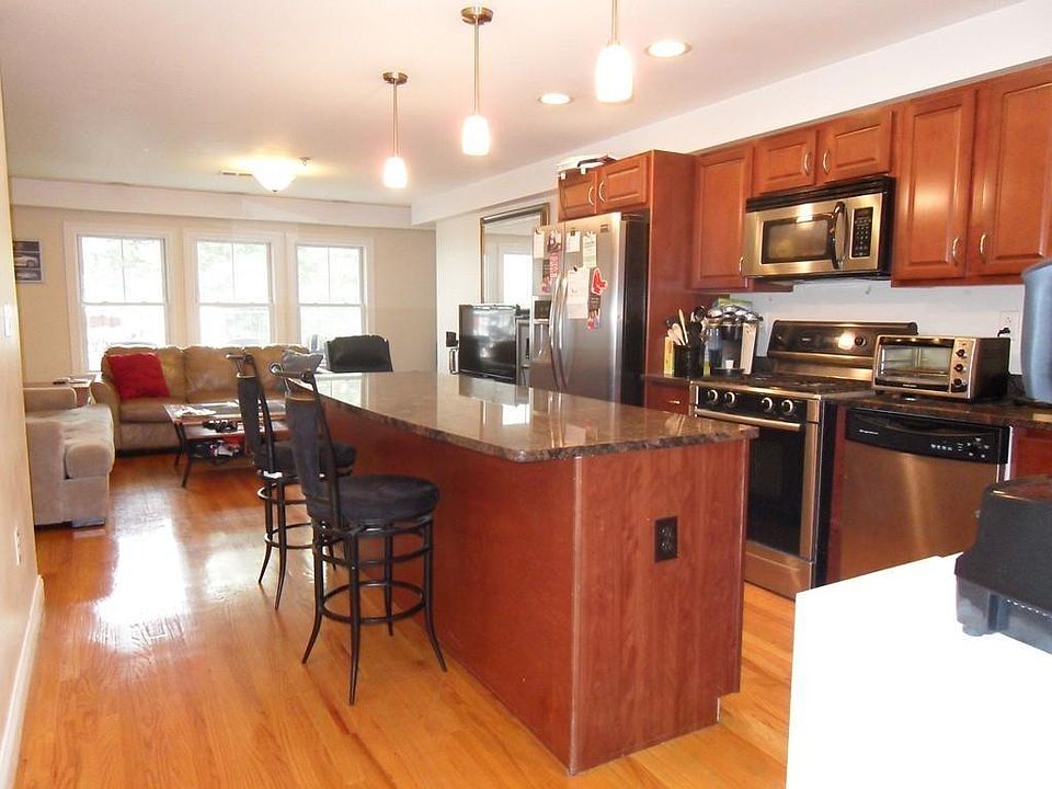 Spacious & beautifully updated condo on sunny 3rd floor. The ultimate find in Brighton - OPEN CONCEPT kitchen/ living area, granite, stainless, high-end gas stove, huge island for cooking & entertaining. Larger than average windows fill each room w/ light. Master has en suite full bath w/ generously sized tile shower & California-style closets lining the entire length of room. The 3 additional bedrooms are all great sizes & sun drenched as well. LAUNDRY IN-UNIT. 1 garage parking (w/ room for storage), 1 assigned off-street parking space, + & plenty of easy street parking. Enjoy treetop views of large shared lawn from private deck. Don't miss out on this gem! Classic detailing, recessed lighting, hardwood floors, & gas fireplace. All the conveniences of Oak Square & Brighton Center - restaurants, shops, cafes, parks, take out, night spots, outdoor dining... Easy access to the MA Pike, Storrow Drive, Express Bus to Copley & Financial District, the 57 and 64. CENTRAL A/C & NO LEAD.