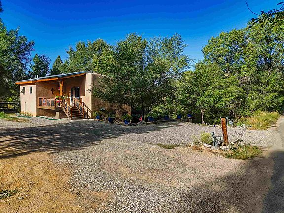 This completely renovated home in the heart of Taos is not to be missed! It is perfectly located within walking distance to Taos Plaza and shops, yet nestled peacefully in the trees. Las Cruces Road is tucked into a sweet, quiet neighborhood, just off Kit Carson Road. A generous front deck greets you upon arrival to this home. Beautiful, carved beams and adobe accents grace the exterior. Inside, you’ll find thoughtful contemporary stylings throughout. This two bedroom, two full bathroom home was entirely, recently renovated. It features all new plumbing and electrical, high end stainless steel appliances, and custom, artful tile work throughout the home. A large, open concept living area expands into a spacious kitchen. Granite countertops, a large center island, double oven, and sophisticated lighting make this kitchen a chef’s dream. One of a kind tile work is featured on the backsplash, a truly artistic cooking environment. Large windows and skylights let plenty of light in, offering views of the treetops. On the same level is a laundry room with plenty of storage, and a full bathroom. The exquisite tile work echos through the shower and tub, as well as the vanity and mirror. A beautiful staircase leading downstairs features stainless steel railings and more artful tile risers. There are two bedrooms and one full bathroom downstairs. The bathroom features a gorgeous glass and tile shower. The large master bedroom boasts a large walk in closet, and French doors that open into a tree filled backyard and a private patio. The spacious yard, set on .25 acres, homes gorgeous shade trees. Listen to the wind and birds as the rest of the world melts away. Stone paver walkways around the home, gardens, a stone wall, and a partially fenced yard enhance the outdoor space. There is an additional 96 square foot storage shed for your tools and toys. This is a beautifully renovated home, in an incredible location. Reach out to set up a private viewing today.