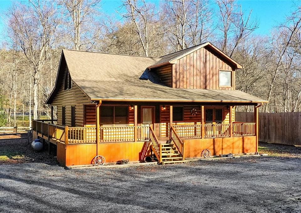 Gorgeous 3 Bedroom 2 Bath Cabin in Cul-de-sac that backs up to stream with a deep wrap around covered porch and a private balcony off the master suite. Home has hardwood flooring throughout, large secondary bedrooms and lots of storage space. The kitchen has granite countertops, stained wooden cabinets and all stainless steel appliances. The Great room has vaulted ceilings and a wood burning fireplace with gas starter. Master suite is oversized and the master bath has separate tub in shower with walk in closets. Allowance for refinishing hardwood floors.