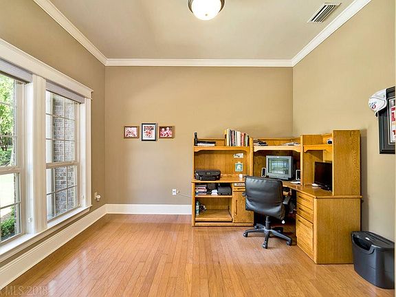 Beautiful golf course home on 4th hole. This single owner 3237 sq ft brick 1.5 story is immaculate with 4 bedrooms, 3.5 bathrooms and upstairs bonus/theater room. Tall ceilings with crown molding. Master suite features a glass tiled shower, jacuzzi tub, double vanities, plantation shutters, and a large walk-in closet. From the Master suite, you can enjoy the golf course via deck, pergola, and hot tub. Living Room offers a gas fireplace that has never been used. Kitchen offers an eat-in breakfast area, bar stool area, granite counters, double oven, electric cooktop, pantry, and island. Formal Dining room as well as office with french doors. Split bedroom plan. Guest bedroom suite offers a tile shower and high vanity. Jack and Jill bathroom services bedrooms 3 and 4. Spacious utility room has a sink and cabinets. Yard is magnificently landscaped to include a pond with fish as well as irrigation system. Screen porch (13x18), alarm system, surround sound, 2 hot water tanks. Double car garage with golf cart garage has epoxy floors. New community pool in neighborhood.