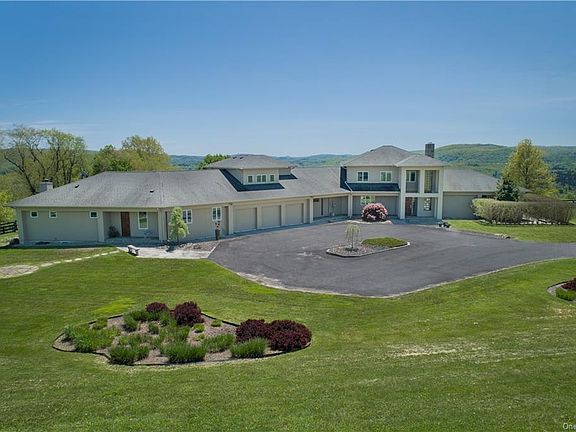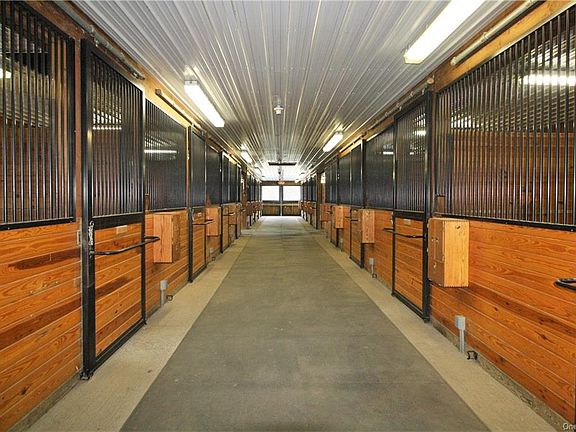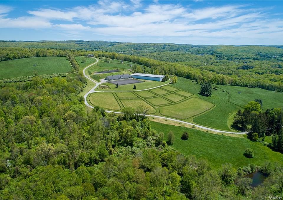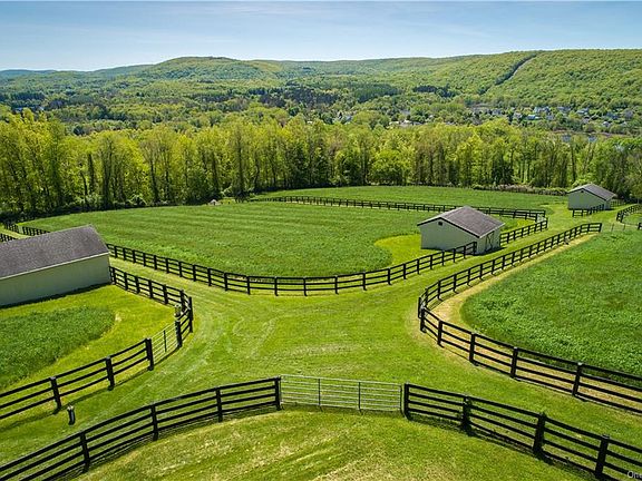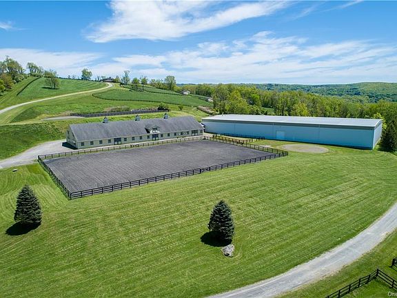 A pastoral landscape of 160 acres of rolling land with panoramic views sets the stage for this state-of-the-art commercial equestrian boarding & training facility. The exceptional equestrian offering includes a 32-stall Zublin-built barn with 5 wash stalls, heated tack, storage, staff, feed, office & full bath; 110 x 270 heated indoor riding arena with viewing room & 2 outdoor riding rings with Lawton Adams designed footings; 24 paddocks; 7 run-in sheds; cross-country schooling field; 4 quarantine stalls; maintenance shop; pump house & 2 BR caretakers apartment. Overlooking this elite facility, with the locale chosen for the stunning views sits a 6,560 SF 5 BR, 6 bath, contemporary home with soaring ceilings, walls of windows & open floorplan. Completing the package, a 1 BR apartment, 3 car heated garage, studio & finished basement. As a NYS Qualified Production Facility this property has been used for 3 productions. This turnkey facility is a remarkable opportunity 90 minutes to NYC.