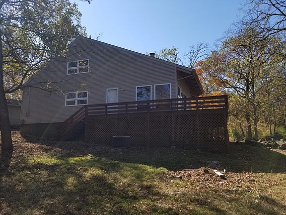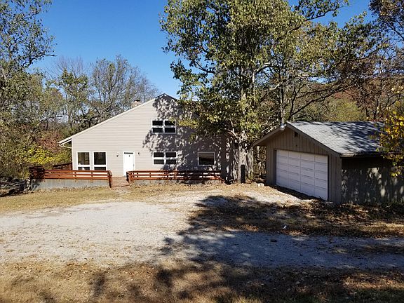 This private and secluded wooded acreage is only a few minutes from Kimberling City and just a short distance to the water. The two-story home has interesting shapes, including a spiral staircase and large wrapping deck. This home has lots of character and unique features, and with a little tlc, has tons of potential. The large great room boasts lots of windows for natural light, a two-story rock fireplace, and wood beams. Sitting on 3.55 acres with no restrictions and flat enough for a garden or additional building. Two car detached garage next to the home and a circle drive at the end of a private road. Boat slips available just a short distance away for additional purchase.