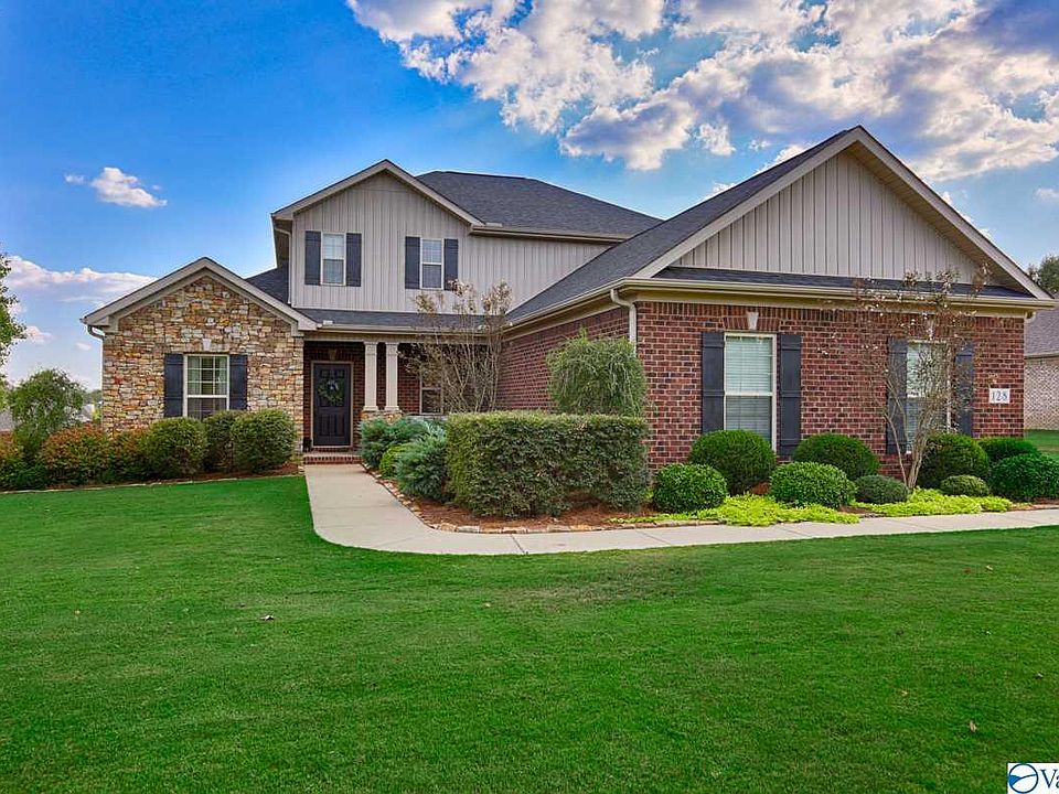 128 Mykeys Way in Mt Carmel by the River. Cozy covered porch welcomes you to this 3 Bed/2.5 Bath Full brick home, built by Mark Harris. Rec Rm could be 4th Bedroom. Hardwood floors throughout the main living areas. Isolated Main Floor Master Suite features Double Vanities, Soaking Tub & Sep Shower and His/Her closets. Upstairs 16x18 RecRm plus Secondary Bedrms. You will LOVE the large fenced in backyard w/covered porch and mountain views! 3Car Garage w/Pedestrian Door & Storm Shelter. Addtl Upgrades: irrigation, floodlights, tilt down front cabinets, Low-E Insulated Energy Efficient Windows -MtCarmel offers 125 acre Flint River Preserve, Lakes, 2 Pools, Clubhouse, Tennis, Walking Trails.