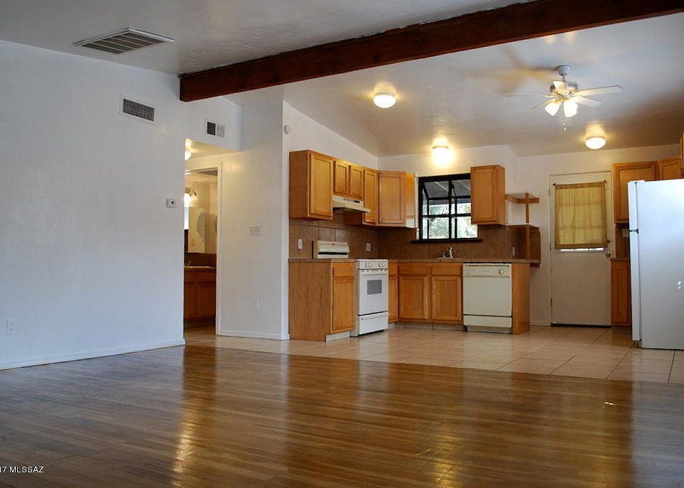 2 Bed 1 Bath in Sam Hughes. Less than 1/2 mile to University of Arizona. Original wood floors in living area and both bedrooms and tile everywhere else. Vaulted wood beam ceilings. Kitchen has gas stove, dishwasher, maple cabinets and tile counters. Central A/C and heat and full size washer/dryer. One bedroom has private access to patio and fenced in yard. Private Yard is fenced on 3 sides of property. Lots of covered patio space and mature landscaping. 2 Carport Spaces and lots other off street parking. This home is offered as NON-SMOKING. Pets subject to owner approval.