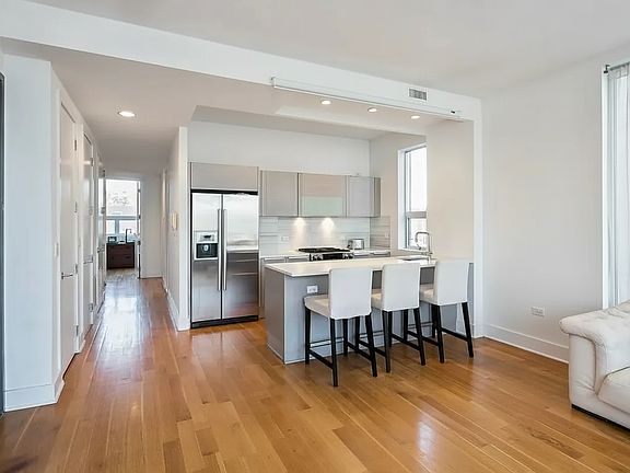The home features gleaming hardwood floors, recessed lighting, and a sleek video intercom system. The contemporary kitchen is equipped with silver oak cabinetry, Caesarstone countertops, and top-of-the-line appliances including a Bosch 36-inch refrigerator, Jenn-Air Pro-Style range, Broan built-in range hood, and DishDrawer. A washer and dryer are conveniently located in-unit.