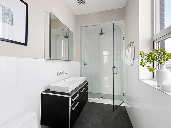 The rear bedrooms are bathed in radiant southern sunlight, especially the primary bedroom with two exposures and access to the large balcony. The porcelain bathrooms are adorned with Mont Blanc stone vanity tops and custom lacquer vanities, complemented by a luxurious deep soaking Neptune bathtub, a frameless glass-enclosed steam shower, a Toto water-saving toilet, and vessel sinks by WET and Sonia. Additional features of this exceptional floor-through home include well-maintained white oak hardwood floors, central heating and cooling, and the convenience of an in-unit washer and dryer.