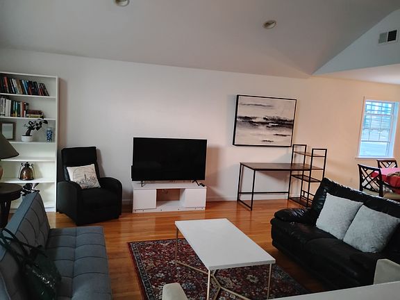 Furnished with King sized in master with personal Bathroom. Queen and double in the other two bedrooms. Cathedral ceilings 30 Minutes to Manhattan NJ Transit Light Rail is one block away. Furnished. Owner pays water. Tenant pays gas and electric. Short term leases available.