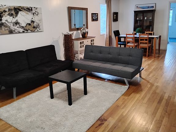 Ground floor apartment with two car garage. Furnished Commuters Dream - One block away from Garfield Ave Light Rail 20 minute commute to Manhattan. Ground Floor Hardwood floors Laundry Room with Washer and Dryer Central Air and Heat Shared Backyard Partial View of Manhattan Garbage Disposal, Dishwasher, Lazy Suzanne Quiet Tree Lined Street Corner coinvienience store Priced, Option to rent furnished Water and Gas Included Owner pays Water and Gas. Tenant pays electric. Furnished Included (optional) Month to month