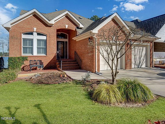 Welcome to White Cap Cottage located in the Cypress Ridge community of Cypress Landing. This beautiful brick 2300+ sq. ft. home overlooks the picturesque Chocowinity Bay and the Cypress Landing 221 slip marina. ''Upon entering the home you will be greeted with a two-story expansive foyer and be immediately drawn to the wall of windows and the stunning water view. Just off the foyer, you will find a Den/Library with built-in bookcases and a cozy two-sided stone fireplace which is shared with an expansive formal dining area.