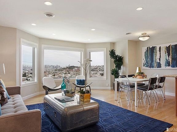 Perched high above Ripley, this condo offers mesmerizing views of the SF skyline, from Twin Peaks to the East Bay. The house-like floor plan offers 4 levels, each separated by few stairs. Level 1: open social space for living/dining/cooking w/views from every corner! Level 2: two rear-facing bedrooms with lush green outlooks, a full bath, laundry, and rear deck. Level 3: a deep storage area and an enormous private view deck. Level 4: the crown jewel of this modern skybox - a master bedroom with two closets, jaw-dropping views of the city and Bernal Hill, an en-suite bath with views from the shower! Next to Bernal Hill park/trails, walk to Cortland Street, Precita Park or down into the Mission. Easy freeway access. One car garage parking.