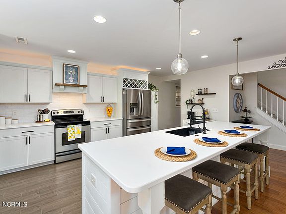 What a fabulous find in Hampstead! From upgraded interiors to a stunning view to a hidden theater room in the basement - you really must see this one in person to understand how unique it is! From the street it's hard to believe all this house has to offer. But walk up to the cozy front porch and step inside, you're going to love it here! The current homeowners have taken excellent care of the property and have made lots of upgrades. Removing the columns from the dining area really opened things up. And new flooring in the full bathroom on this level is lovely. But wait until you see the kitchen! Just fabulous! It has been beautifully remodeled and has loads of storage. Off the foyer, the bedroom is currently being used as an office and comes complete with a Murphy bed. The desk is negotiable if you'd like to keep this perfect room as-is. Upstairs you'll find the very large primary suite with impressive closet space and gracious ensuite. This retreat is the perfect place to unwind and rejuvenate. You'll also find three additional bedrooms on this level, along with the laundry room - so convenient! Now head down to the basement to check out the real star of the show - the finished basement. Everything you could ever want is right here in your own home! Gym space - you've got the perfect set up. Bar area - the wall shelving and custom bar (negotiable) are the ideal spot to entertain. Additional office space - check out the built in desks. Family room - yes, that's here, too. But the coolest spot in the house is hidden behind the mirror. A gentle push opens this secret door to unveil the movie room of your dreams. The theater seating, beanbags and projector stay with the house. No need to unpack the first night! Curl up with friends, family, neighbors, or binge a show all on your own. This place is awesome! Don't forget to check out the backyard and your beautiful view! The lot is over an acre so you have limitless options back here. Dogs, kids, gardening, entertaining - everyone is going to love this yard! And if all that isn't enough, the location is second to nne. Dogwood Lakes is tucked just off Hwy 17 right between Hampstead and Jacksonville. Not only is this the ideal location for a commute in either direction, this is also the perfect spot to access the beach! Even though your mailing address is Hampstead, you are covered by all the amenities offered by Surf City - including beach parking! Like to travel? You have several airports nearby. Give me a call and let's see this one TODAY!