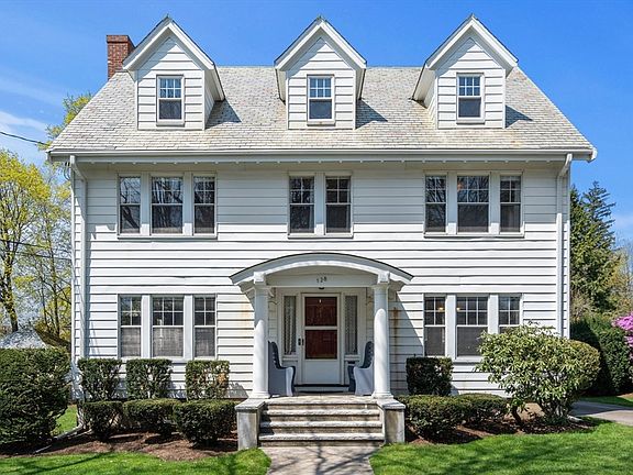 Center entrance colonial w/ 4 beds, 2.5 baths located near the top of one of Watertown's most desirable streets in the most coveted neighborhood! Welcome to 128 Russell Ave! The front door opens to an impressive foyer flanked by a bright living room w/ fireplace and spacious dining room w/ decorative wainscoting. The kitchen has granite countertops, SS appliances, and ample storage. Finishing off the 1st level is a half bath and a beautiful sitting room off the living area. The 2nd floor has 4 bedrooms and 2 full baths. The front-to-back primary has a large closet, hardwood floors, 3/4 bath w/ laundry, and an additional sitting room. The lower level is finished and the perfect recreation area. There is a walk-up attic for current storage and future potential! A large fence-in yard is perfect for children, pets, entertaining. Plenty of parking w/ a 2 car garage and paved driveway. Blocks away from the future net zero High School and public transit. Minutes to Cambridge and Boston.